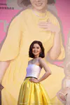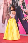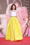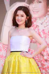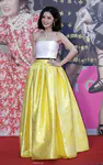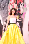 蔡卓妍戴Bvlgari珠宝耳环项链,身穿Alex Perry 2018春夏系列柠檬黄拼色抹胸缎面裙。
